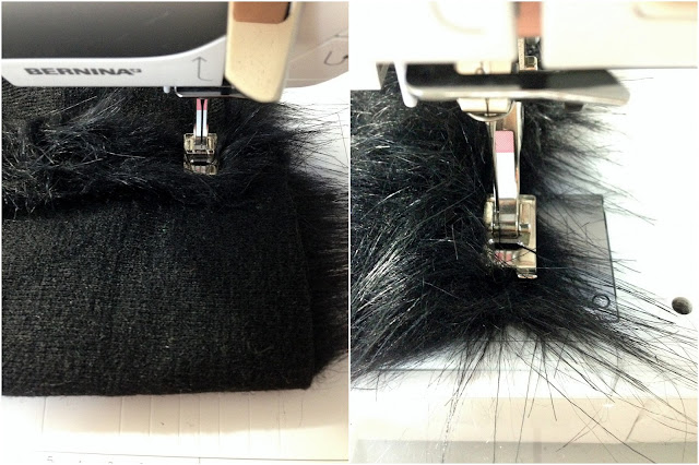 4. Reach your arm inside from the other end, and pull the tube right side out. (Flatten seams as much as you can. You can't really use an iron to press the seams very well in this thick faux fur, but you can flatten them with your hand.) Then, on the open side, turn the edges under 1/2 and topstitch (I used a zigzag to blend in with the fur better).