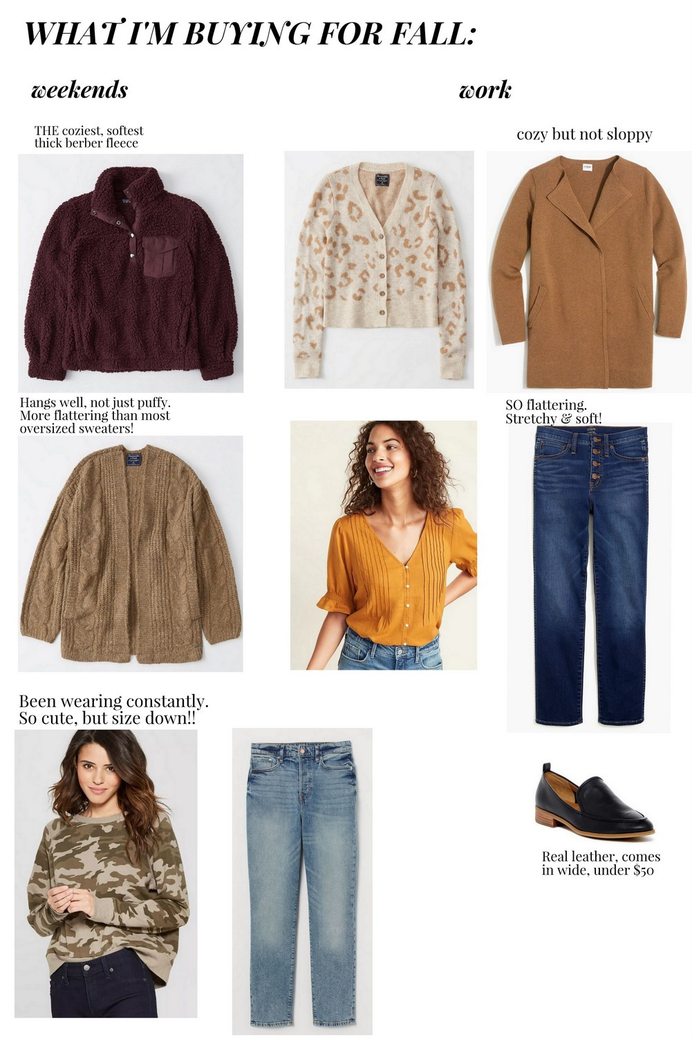 Faves so far are that camo sweatshirt (wearing it as I type this--the perfect at-home comfy piece that still makes me feel current and cute), and these jeans are so, so flattering! I am 100% on Team High Waisted Jeans and have been needing some new ones that aren't skinny in the leg. (Love them--you should also size down in these!) It's hard to find cute jeans that don't have raw hems these days, so both of the pairs in this collage are a little more versatile than the raw ones.